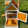 Our stunning Farm House Natural Chicken Coop has a metal lined pull out tray for easy cleaning. A big front door including an access ramp will make it easy for your chickens to get in and out and to add ventilation to your coop.